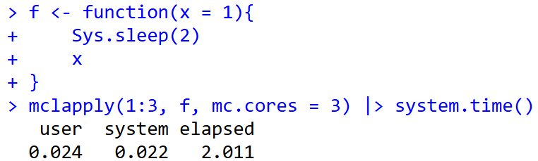 lapply(1:3, f) |> system.time() user system elapsed