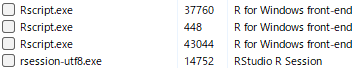 cl <- makeCluster(3)makeCluster関数を実行後、リソースモニターで確認すると、RstudioのRセッション(rsession-utf8.exe)以外に3つのRセッション(Rscript.exe)が実行されていることがわかります。