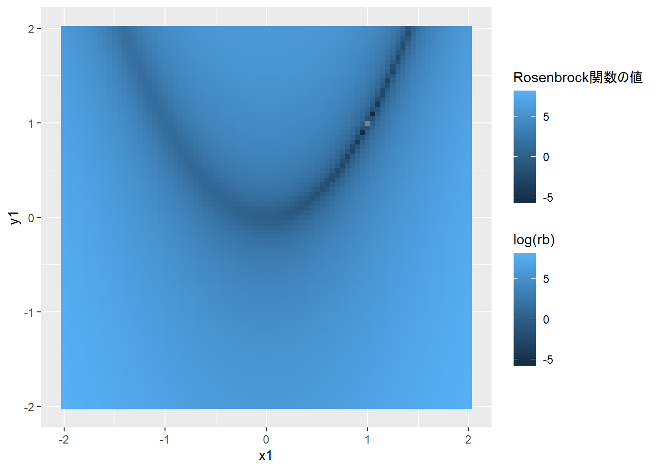 labs(x="x1", y="y1", color="Rosenbrock関数の値")