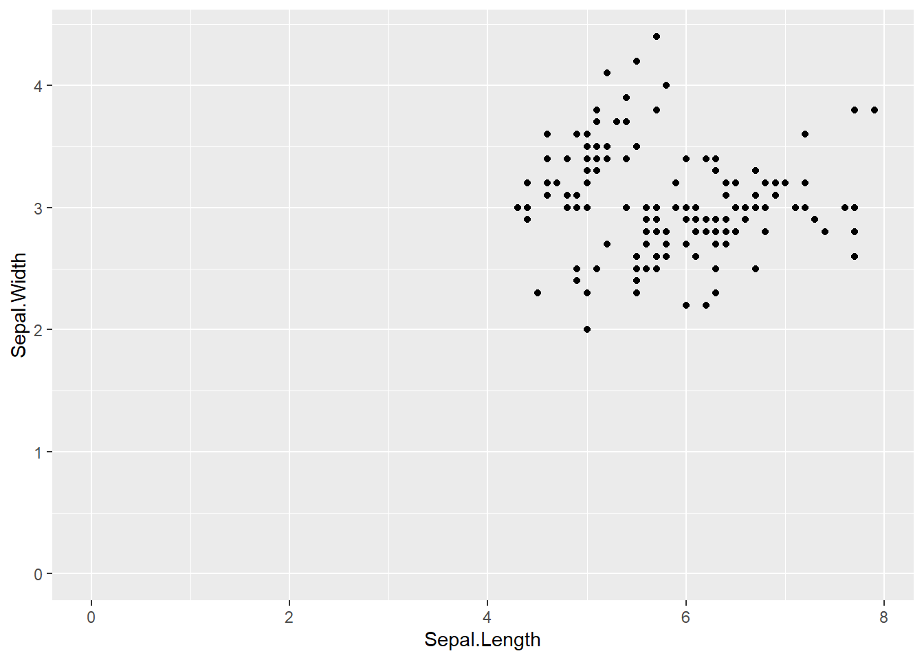 theme_bw()上記のグラフでは、Sepal.WidthもSepal.Lengthも最小値が0になっておらず、いわゆる「下駄をはいている」グラフになっています。ggplot2でx軸、y軸の最小値を指定する場合、expand_limits関数を用います。expand_limitsでは、x軸の最小値、y軸の最小値をそれぞれx、yの引数に指定します。