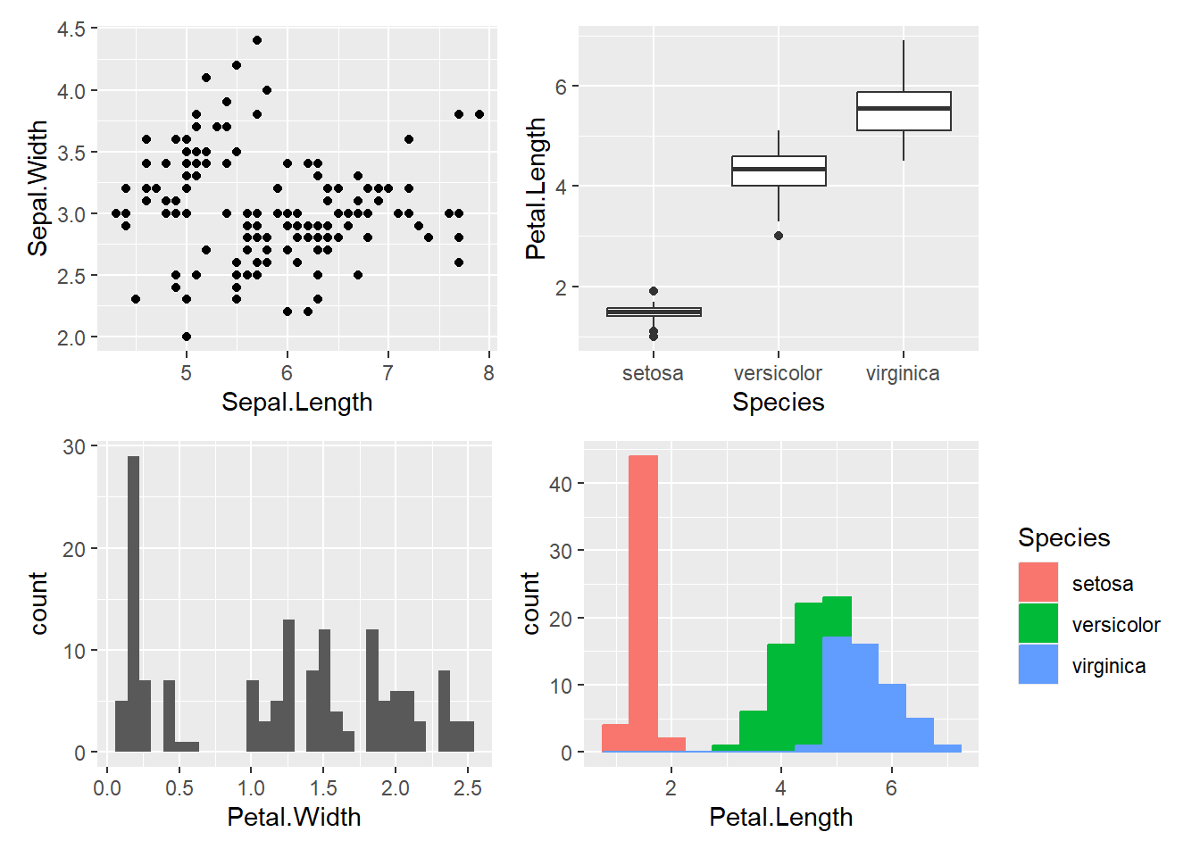 p4 <- iris |> ggplot(aes(x = Petal.Length, color = Species, fill = Species)) + geom_histogram(binwidth = 0.5)グラフを横に並べて表示するときには、+でオブジェクトを繋ぎます。