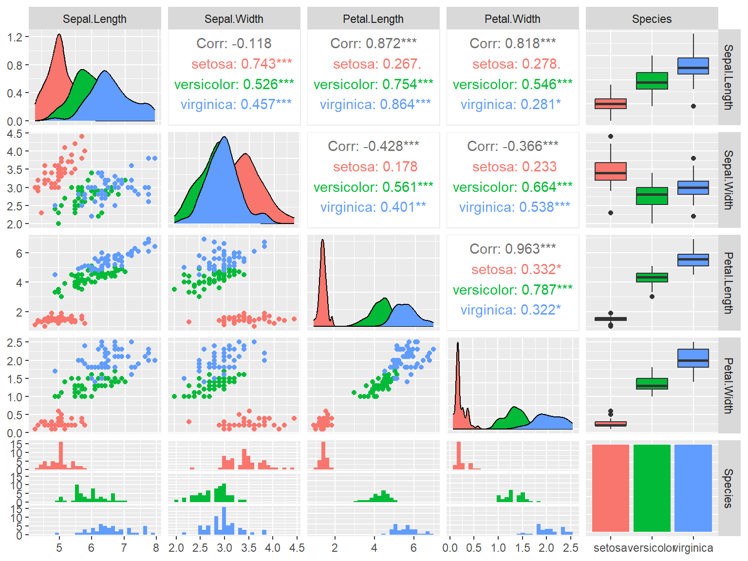 anim_save("p.gif", animate(p, renderer = gifski_renderer())) # 描画の方法を指定GGally(Schloerke et al. 2023)はggplot2を使って、相関行列を描画するためのExtensionです。各列のデータの型に従い、表示するグラフの形を変えてくれたり、相関係数を表示してくれたりします。pairs関数を用いてグラフを書くよりもデータの特徴をとらえやすい相関行列の図を簡単に作成することができます。