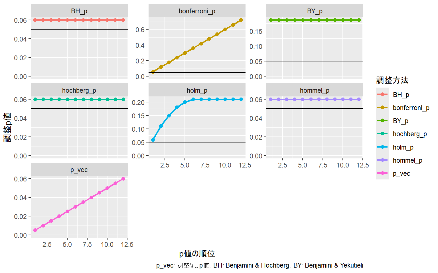 p値調整の手法ごとのp値の値を比較したグラフを以下に示します。