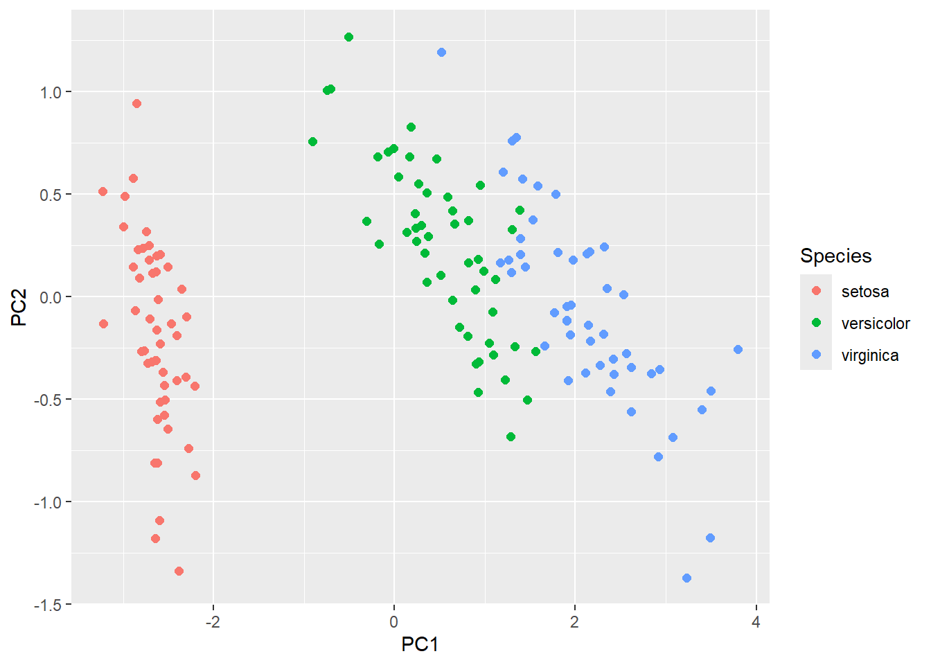 iris.pc<-prcomp(iris[ ,1:4])irispcd<-iris.pc$x|>as.data.frame()irispcd$Species<-iris$Speciesggplot(irispcd, aes(x =PC1, y =PC2, color =Species))+geom_point(size =2)