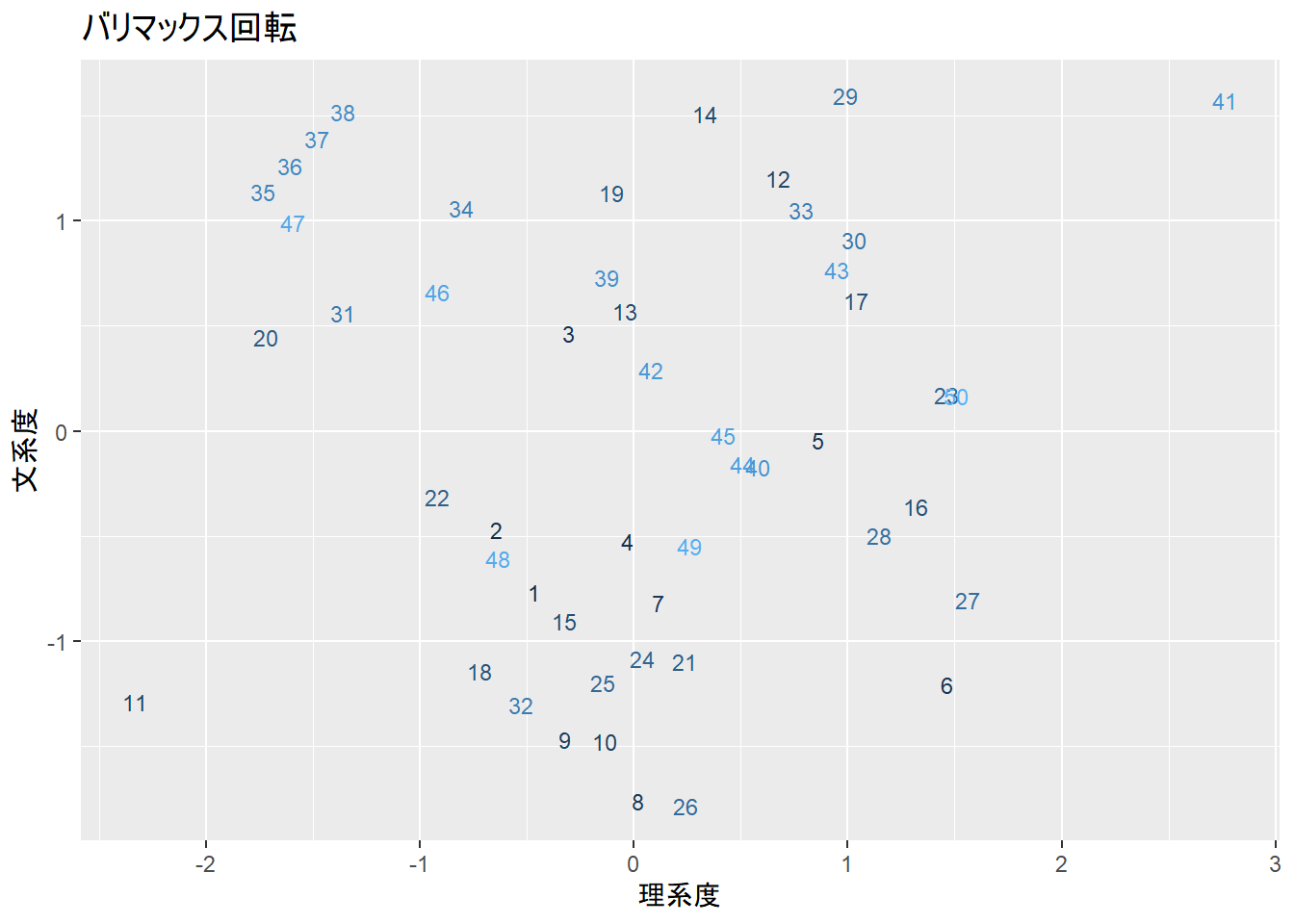 m1vs<-m1v$scores|>as.data.frame()# 計算したスコアをデータフレームに変換m1vs$student<-1:nrow(m1vs)# 生徒のIDを追加ggplot(m1vs, aes(x =Factor1, y =Factor2, color =student, label =student))+geom_text(size =3)+theme(legend.position ="none")+labs(title ="バリマックス回転", x ="理系度", y ="文系度")