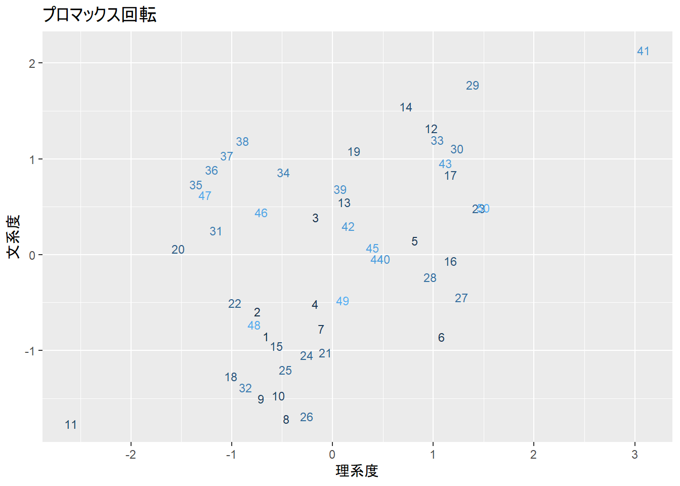 m1ps<-m1p$scores|>as.data.frame()m1ps$student<-1:nrow(m1ps)ggplot(m1ps, aes(x =Factor1, y =Factor2, color =student, label =student))+geom_text(size =3)+theme(legend.position ="none")+labs(title ="プロマックス回転", x ="理系度", y ="文系度")