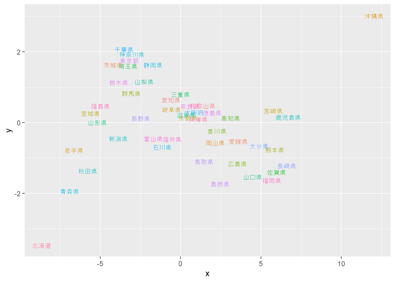 JPpos2<-JPD%>%cmdscale%>%as.data.framecolnames(JPpos2)<-c("x", "y")JPpos2$prefecture<-prefectureggplot(JPpos2, aes(x =x, y =y, label =prefecture, color =prefecture))+geom_text(size =3)+theme(legend.position ="none")
