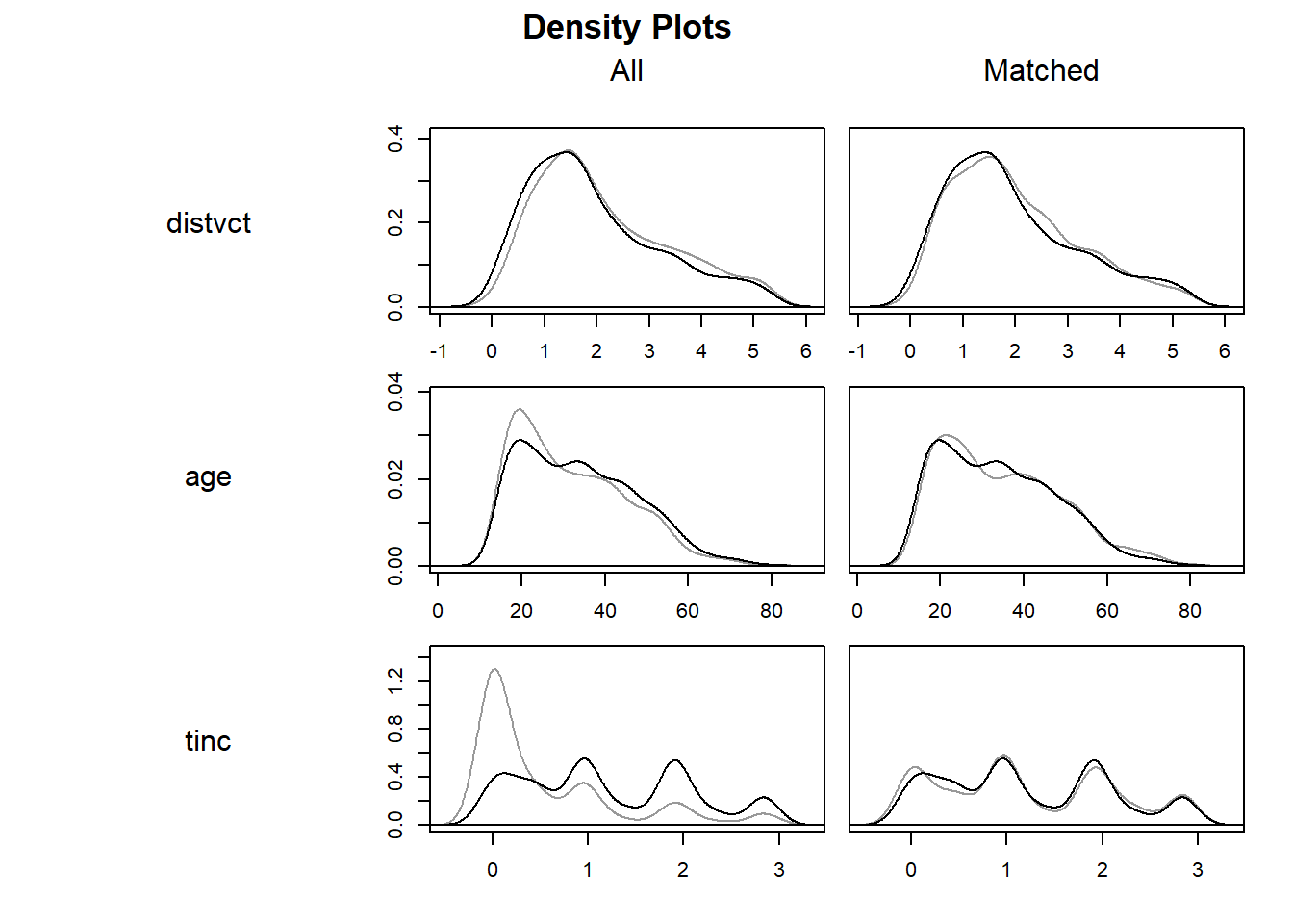 ここで、cobaltパッケージのlalondeデータセットを見ると、処置群が185例、対照群が429例となっています。つまり、元々のLalonde (1986)で示されているデータとは少し違うものを利用しているようです。