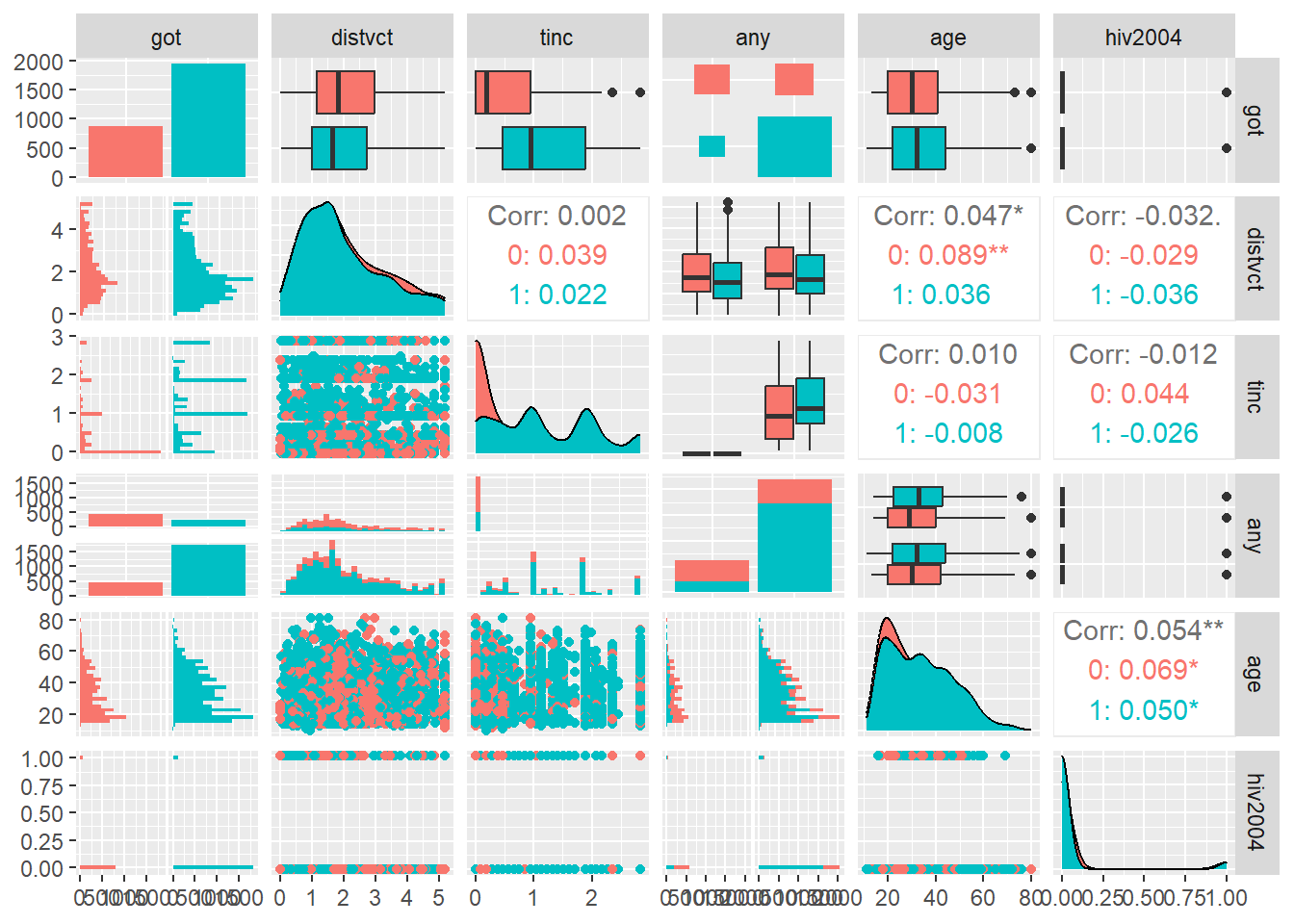 villnumは居住地(市町村)のIDで、統計モデルに加えると過度に複雑になるので取り除きます。villnum以外のデータを26章で紹介したGGallyパッケージ(Schloerke et al. 2023)で示すと以下のようになっています。HIV検査を受けた人(got = 1)は全体の2/3程度で、インセンティブを受けている人(any = 1)が多く、HIV陽性の人(hiv2004 = 1)はかなり少なめであることがわかります。
