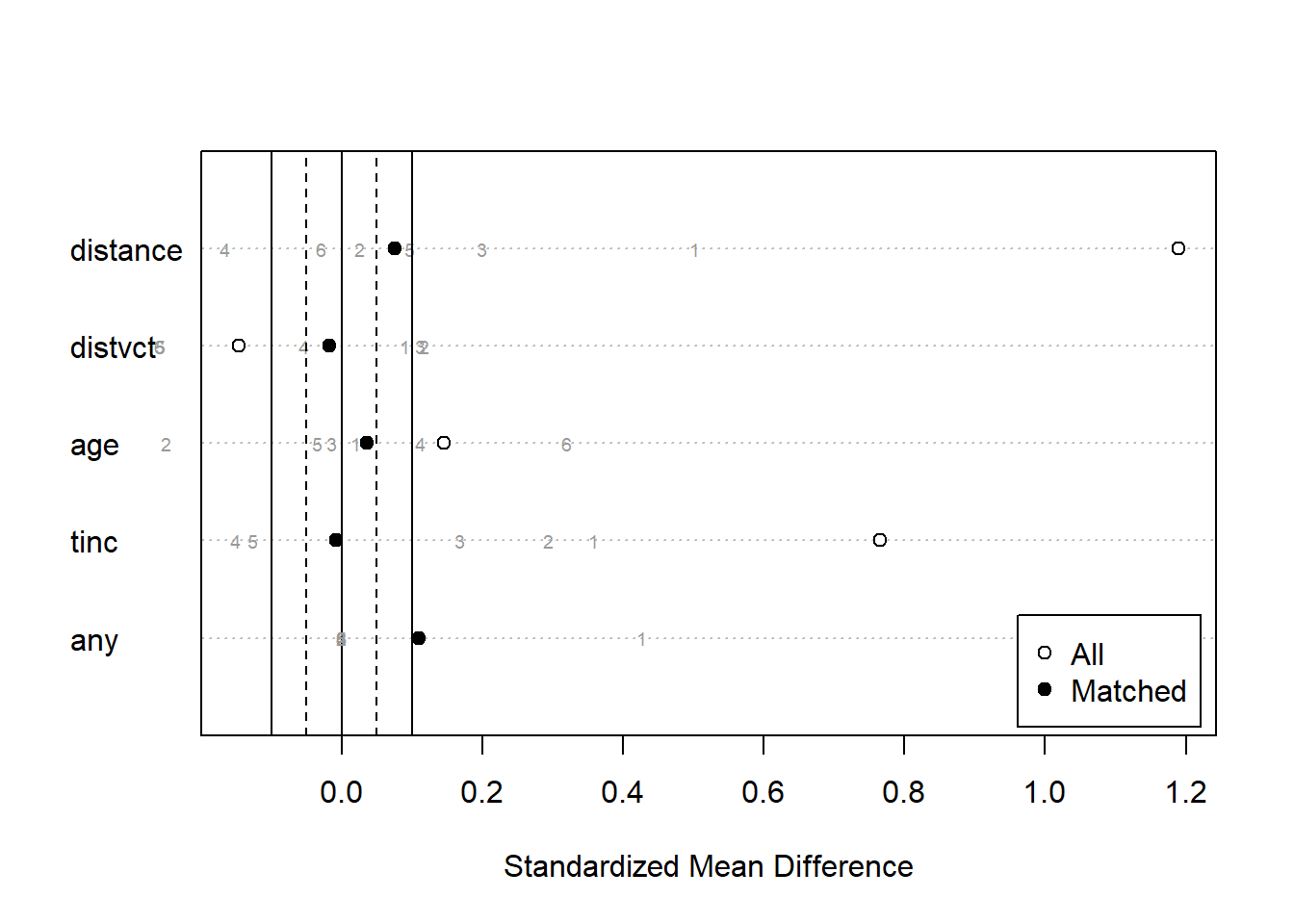 W <- weightit(got ~ distvct + age + tinc + any, method = "glm", data = hiv, estimand = "ATE")weightit関数で計算した重みについて、cobaltパッケージのbal.tab関数を用いることで共変量の調整に関して評価することができます。Effective sample sizesのうち、Adjustedの数値がなるべく大きくなるような手法(method)をweightit関数で用いるとよい、とされているようです。