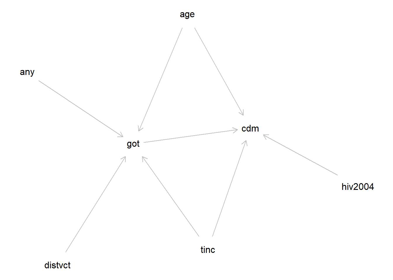 facet_wrap(~ any)上記のデータでは、以下の図で示すような因果関係がある、と想定して作成しています。以下の図はdagittyパッケージ(Textor et al. 2016)で作成した、DAG(Directed Acyclic Graph)と呼ばれるタイプのネットワーク図の一種です。DAGも因果推論において重要なツールであるとされているので、後ほど51章で説明します。