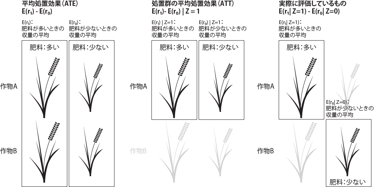 上記の通り、「作物に肥料を与えると収量が増える」は必ずしも真ではありませんが、たくさんの仮定がある場合、例えば与える水の量がおなじで、おなじ場所で育てており、おなじ温度、おなじ日照量で、害虫などの影響がなく、作物の遺伝的背景がおなじであれば、因果関係として成立します。つまり、肥料以外の条件が全くおなじであれば、肥料の少ない条件で育てた作物より、肥料の多い条件で育てた作物の収量が多くなる、という因果関係が成立します。