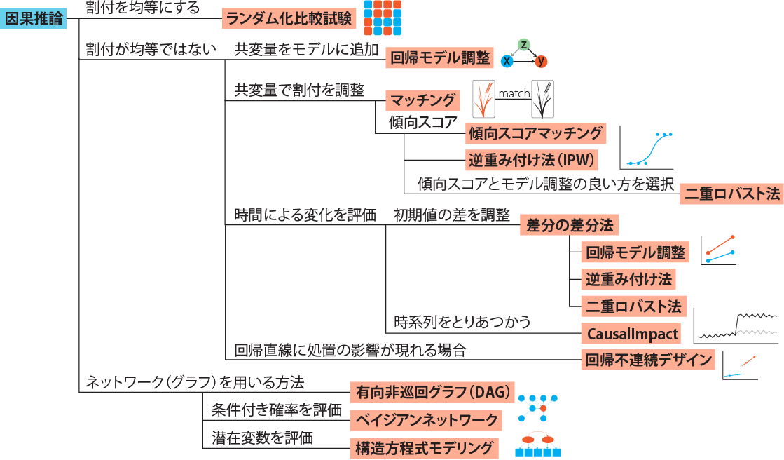 このように、共変量の影響が残っていたり、影響がわからない場合において、共変量の影響をなるべく小さくし、処置(割付、原因)と結果の因果関係を評価する統計の手法のことを因果推論(Causal inference)と呼びます。因果推論には様々な手法があります。49章・50章・51章では、因果推論の手法の簡単な説明と、Rでの演算方法を紹介していきます。紹介する手法を以下の図に示します。49章ではランダム化比較試験から傾向スコアまで、50章では差分の差分法と回帰不連続デザイン、51章ではネットワークを用いる手法(有向非巡回グラフ、ベイジアンネットワーク、構造方程式モデリング)について、例を提示して演算方法を示します。