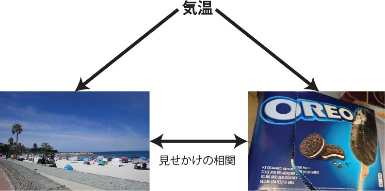 また、2つの量の相関が他の因子により生まれることもあります。例えば、全国の海水浴場の客数と、ある製菓企業のアイスクリームの売り上げには正の相関があるかもしれませんが、海水浴場の客がアイスクリームを買うから因果関係がある、というわけではありません。海水浴場の客数やアイスクリームの売り上げは共に気温による影響を受け、温度が上がると海水浴場の客数もアイスクリームの売り上げも増加します。つまり、海水浴場の客数とアイスクリームの売り上げの間の相関は気温を介した、意味のない、見せかけの相関であると言えます。