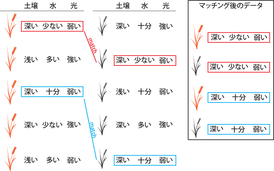 複数の作物をランダムに肥料の少ない・多い条件に割り当てる(割付)ことで、条件の間で場所・日照量・遺伝的背景の分布を概ね一致させることができます。このように、割付をランダムに行う実験のことをランダム(無作為)化比較試験(Randomized Controlled Trial、RCT)と呼びます。前章で説明した実験計画では、RCTとなるように説明変数をランダムに割り付け、実験を組みます。