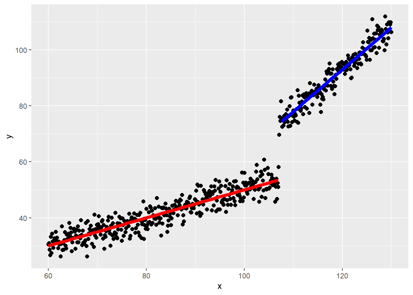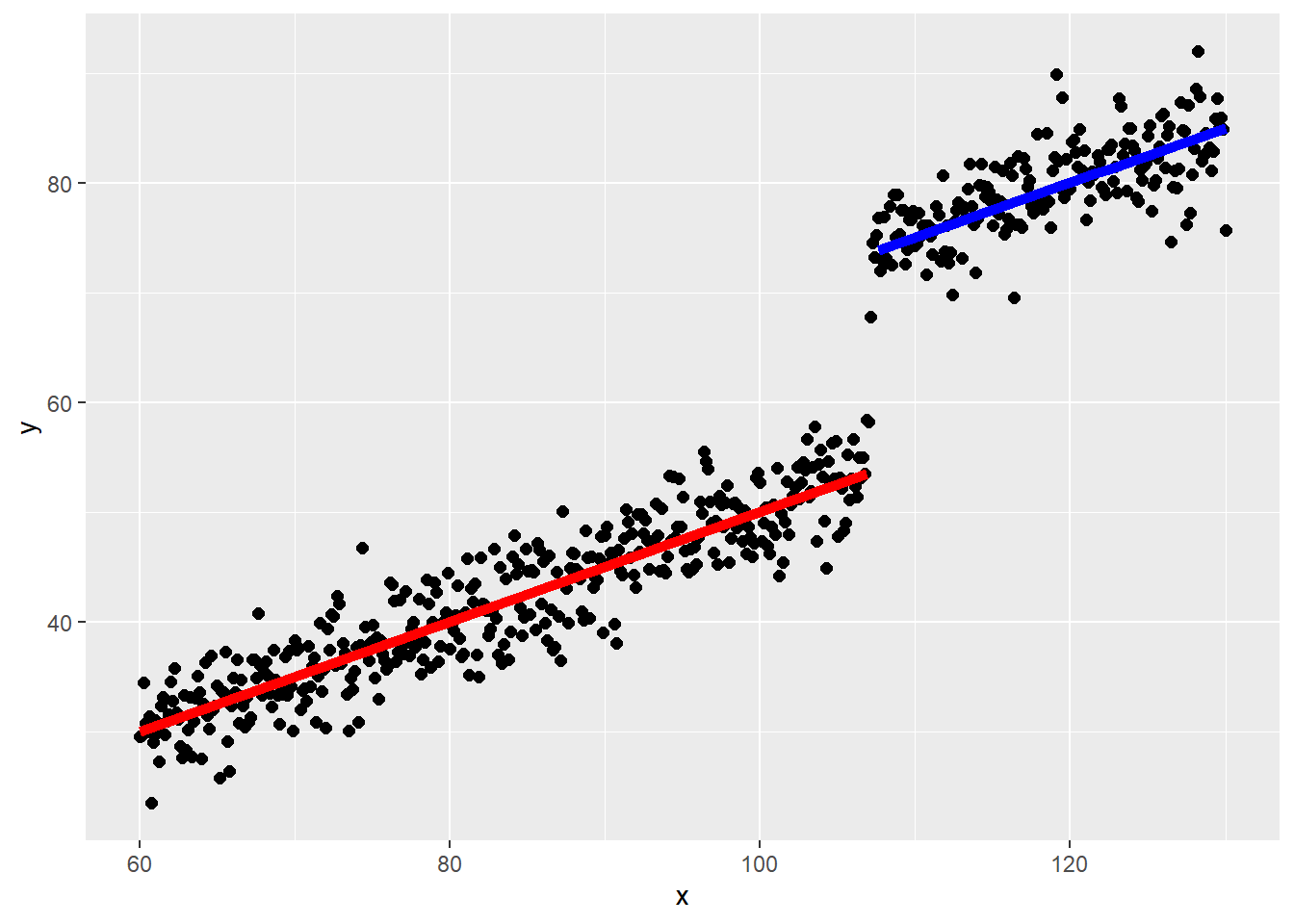 }}), color = "blue", linewidth = 2)上記のような、線形がある点で分断していても、傾きは変わっていないような、単純な不連続性の場合であれば、線形回帰を用いれば処置の効果の大きさは以下のような線形回帰で簡単に求めることができます。