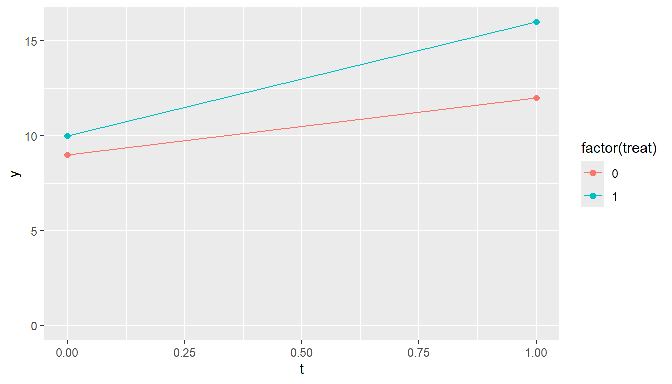 DIDを適用する最も単純なパネルデータは、処置群の時点0、時点1、対照群の時点0、時点1の4つのデータがある場合です。このような場合には、DIDの演算は単純で、線形回帰を行い、交互作用のパラメータがATTとして求まります。以下の例では、ATTは3になります。