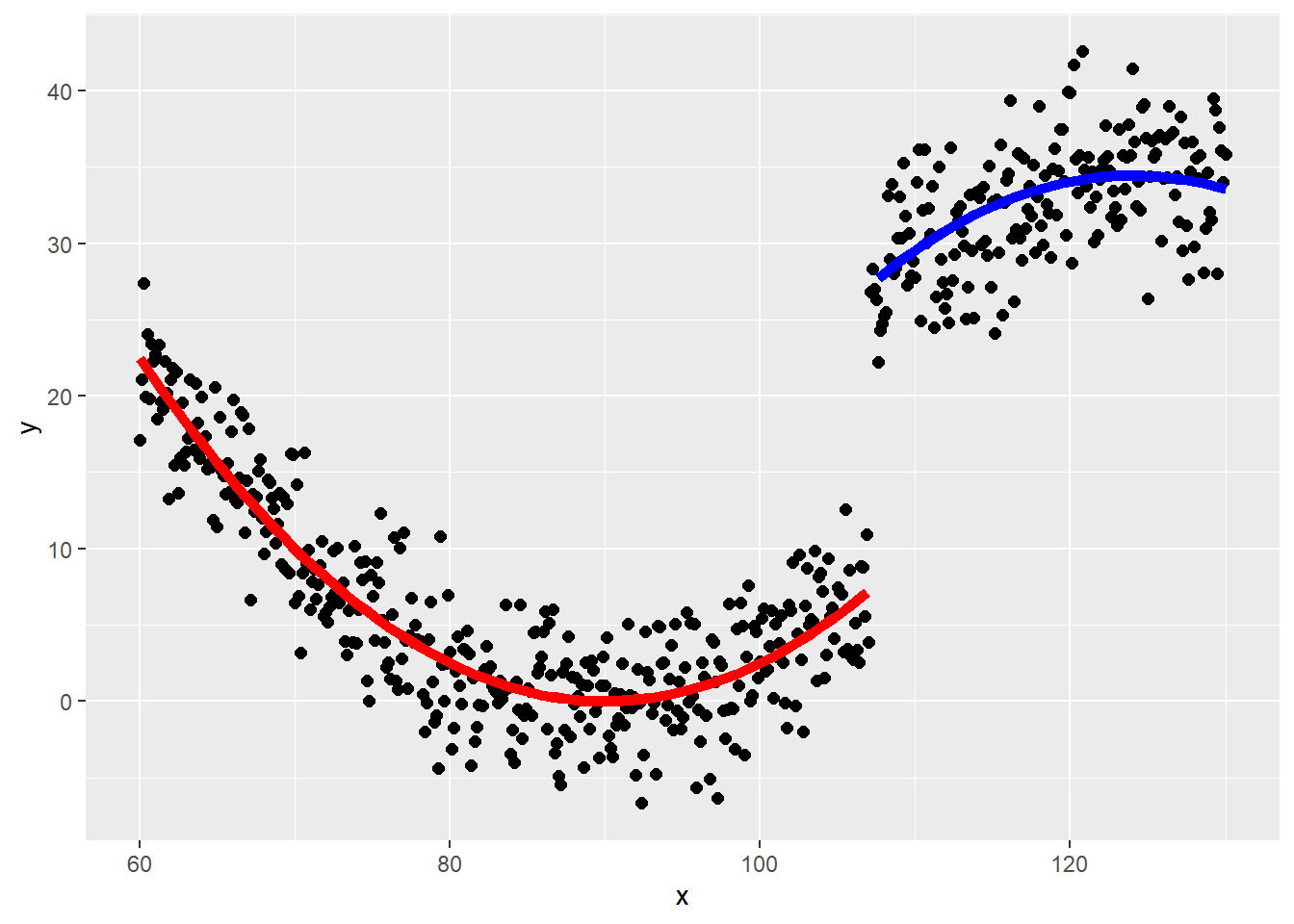 0.025 * (x-90)^2 + 20 * z - 0.05 * (x - 107)^2 * z + rnorm(length(x), 0, 3)