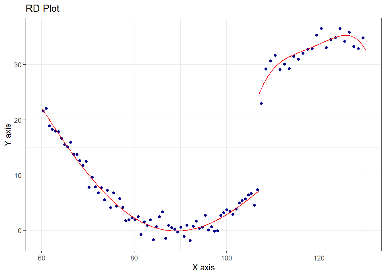 rdplot関数は、回帰不連続デザインのデータをグラフで表示してくれる関数です。引数はrdbwselect関数と同じです。rdplot関数はカットオフ値の前後を局所多項式回帰で回帰して表示してくれます。