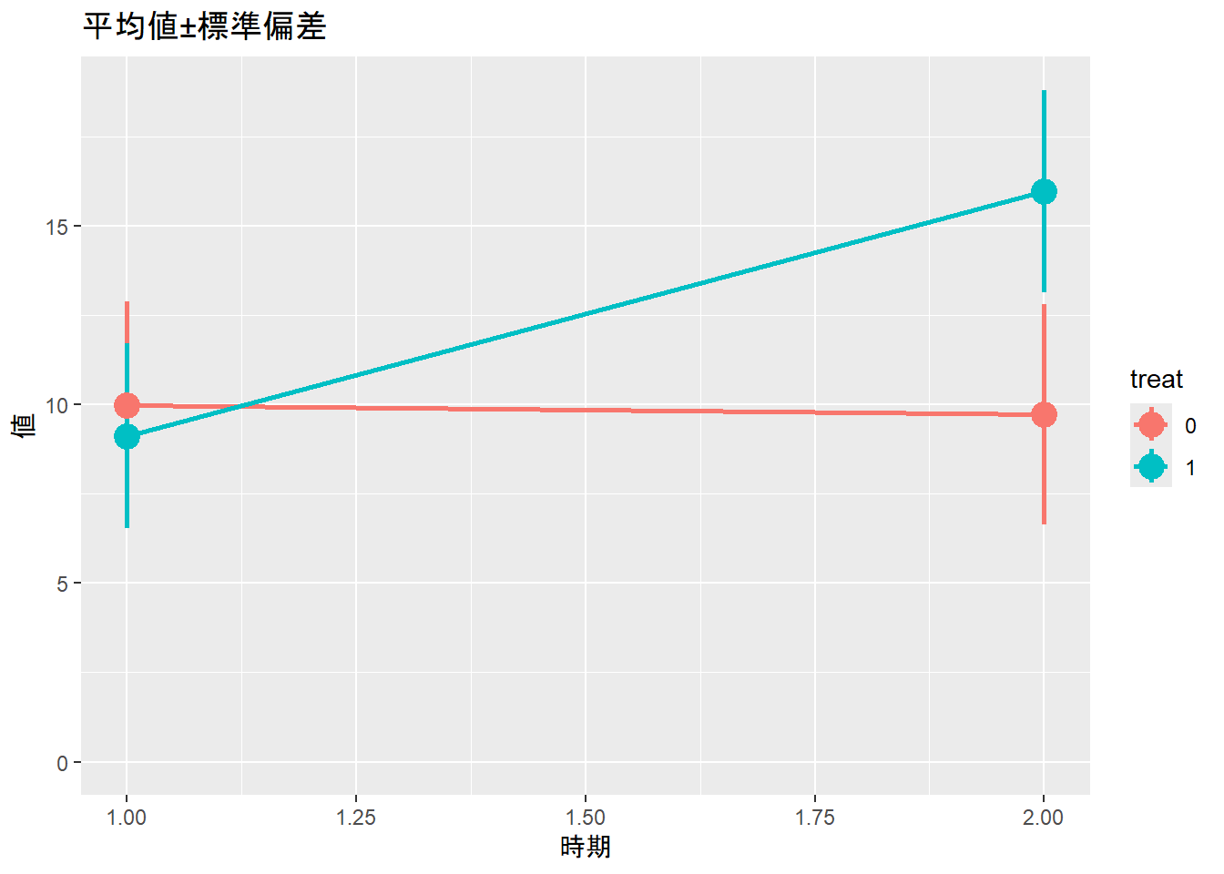 labs(title = "平均値±標準偏差", x = "時期", y = "値") +