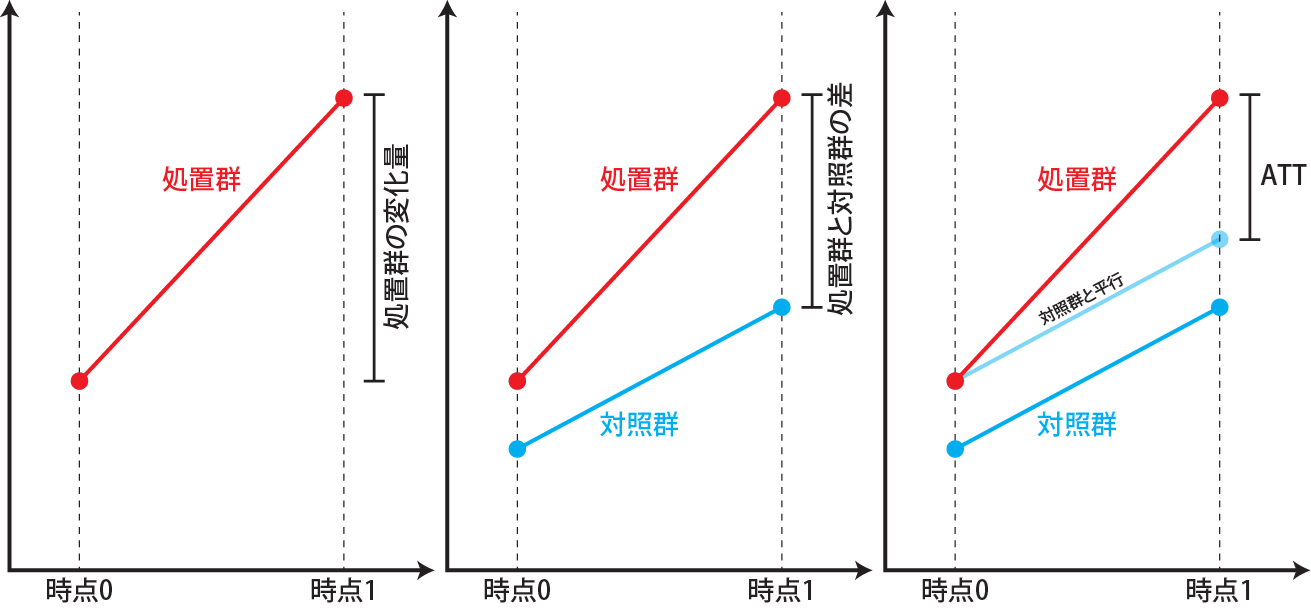 差分の差分法では、あるものに処置を行った前後の変化を評価の対象とします。ただし、処置群の処置前後の値の差のみを評価すると、処置による効果と処置をしなかった場合(対照群)の変化の違いをうまく評価できません(下図左)。また、単純に処置群と対照群の処置後の差を取っても、初期値に差があるため、その差が処置の効果である、とはすることができません(下図中央)。そこで、差分の差分法では処置を行ったもの(処置群)と処置を行わなかったもの(対照群)の処置前後の値を比較することで、処置による効果(ATT、\(E(r_1|Z=1)-E(r_0|Z=1)\))を求めます。