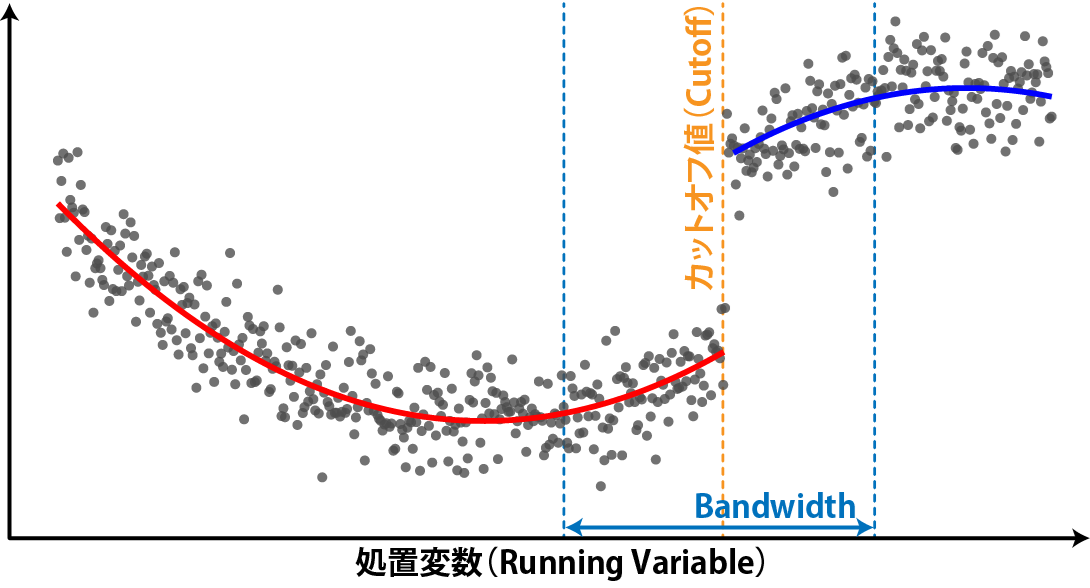 ですので、明確にトレンドが直線的ではない場合、カットオフ値付近のデータのみを処置効果の評価に用いることで、共変量の影響を小さくすることができます。この評価に利用するカットオフ値付近のデータの幅のことをBandwidthと呼びます。