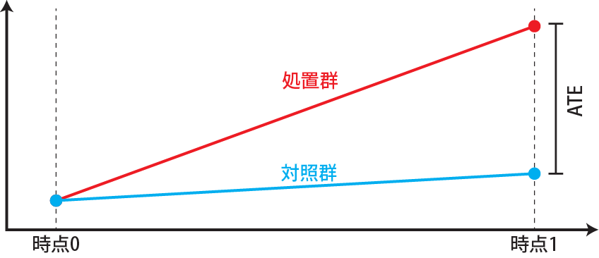 治験などのRCTでは、ヒトが生まれた瞬間から試験を開始することは(当たり前ですが)できません。ですので、成長したヒト(成人)に評価したい薬(処置群)とプラセボ(有効成分の入っていない薬、対照群)を飲み始めてもらいます。その後一定の期間が経った後に、処置群と対照群の差、つまり処置によって健康状態が改善したかどうかを評価します。ですので、治験などの多くの実験では処置前と処置後の時点間の結果の差を評価していることになります。このように時点間で結果を評価する場合、初期値が一致しており、無作為化が実施されていることが重要です。初期値が一致し、無作為化により共変量の偏りが無ければ、処置後の結果の差をATEであるとして評価することができます。